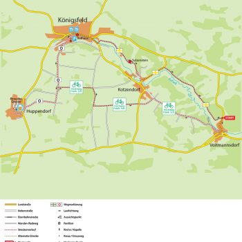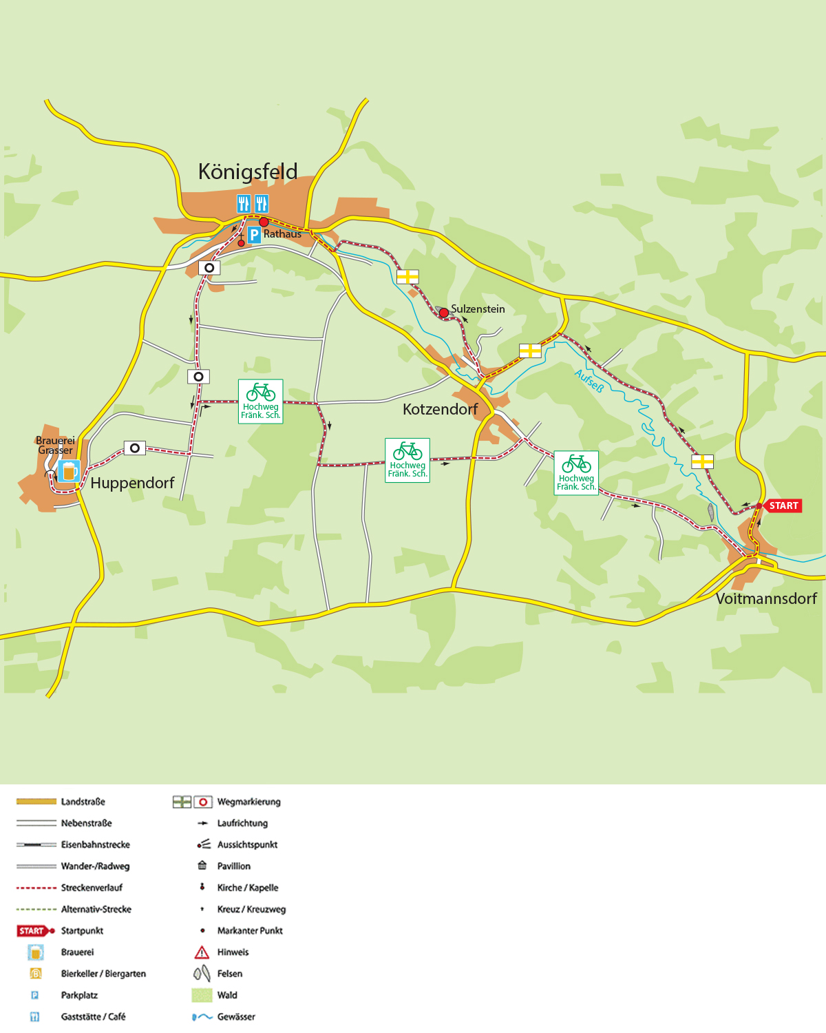 Nun biegt der Weg in die Straße „Jakobsberg“ Richtung Kirche ab. Der Markierung schwarzer Kreis folgen Sie aus Königsfeld hinaus bis nach Huppendorf, wo die einzige Brauerei dieser Tour zu finden ist. Auf demselben Weg geht es jetzt wieder aus Huppendorf heraus, allerdings folgen Sie nun dem ausgeschilderten Radweg „Hochweg Fränkische Schweiz“ und gelangen auf ihm wieder