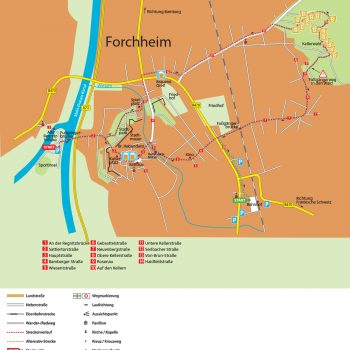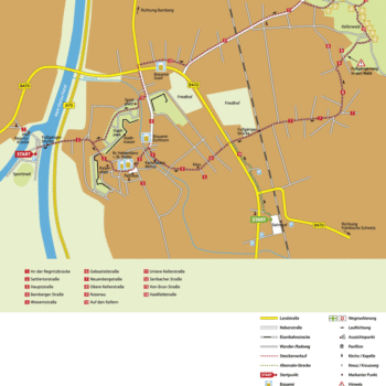 Nach der Brücke folgen Sie der Sattlertorstraße bis zu der Kaiserpfalz, den ersten zwei Brauereien und dem schönen Rathausplatz. Von dort geht es weiter (halb links halten) über die Hauptstraße zur Bamberger Straße und nach kurzem links in die Wiesentstraße. Vorbei an der schiefen Kammerers Mühle führt Sie der Weg bis zur B 470, die Sie kreuzen, bevor Sie dann auf der anderen Seite gerade (Fußgängerbrücke) die Eisenbahn überqueren. Nun geht es den Berg hinauf zum Kellerwald mit seinen vielen Bierkellern.