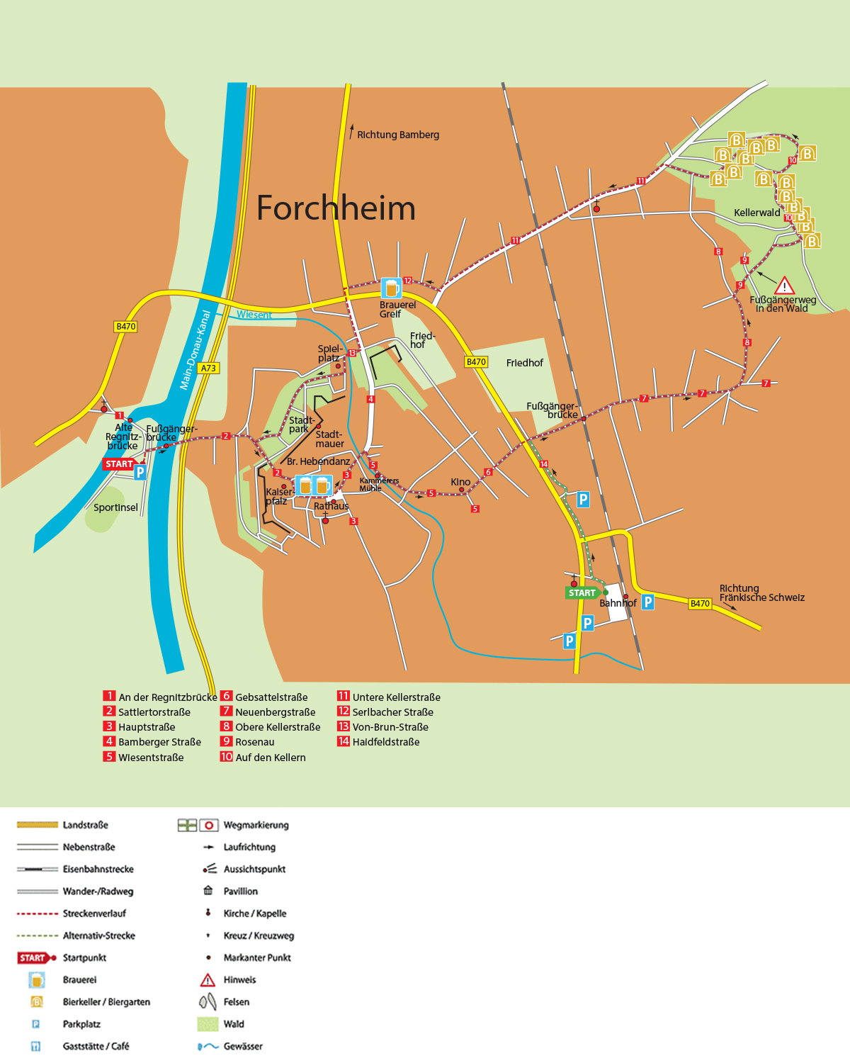 Startpunkt ist der Parkplatz auf der Sportinsel direkt am Main-Donau-Kanal. (Alternativ können Sie auch am Bahnhof starten -> grüne Route. Dann führt Sie die Tour zuerst in den Kellerwald und danach zu den Brauereien in der Stadt.) Vom Parkplatz aus führt eine Treppe hinauf zur Fußgängerbrücke, die Sie über den Kanal und