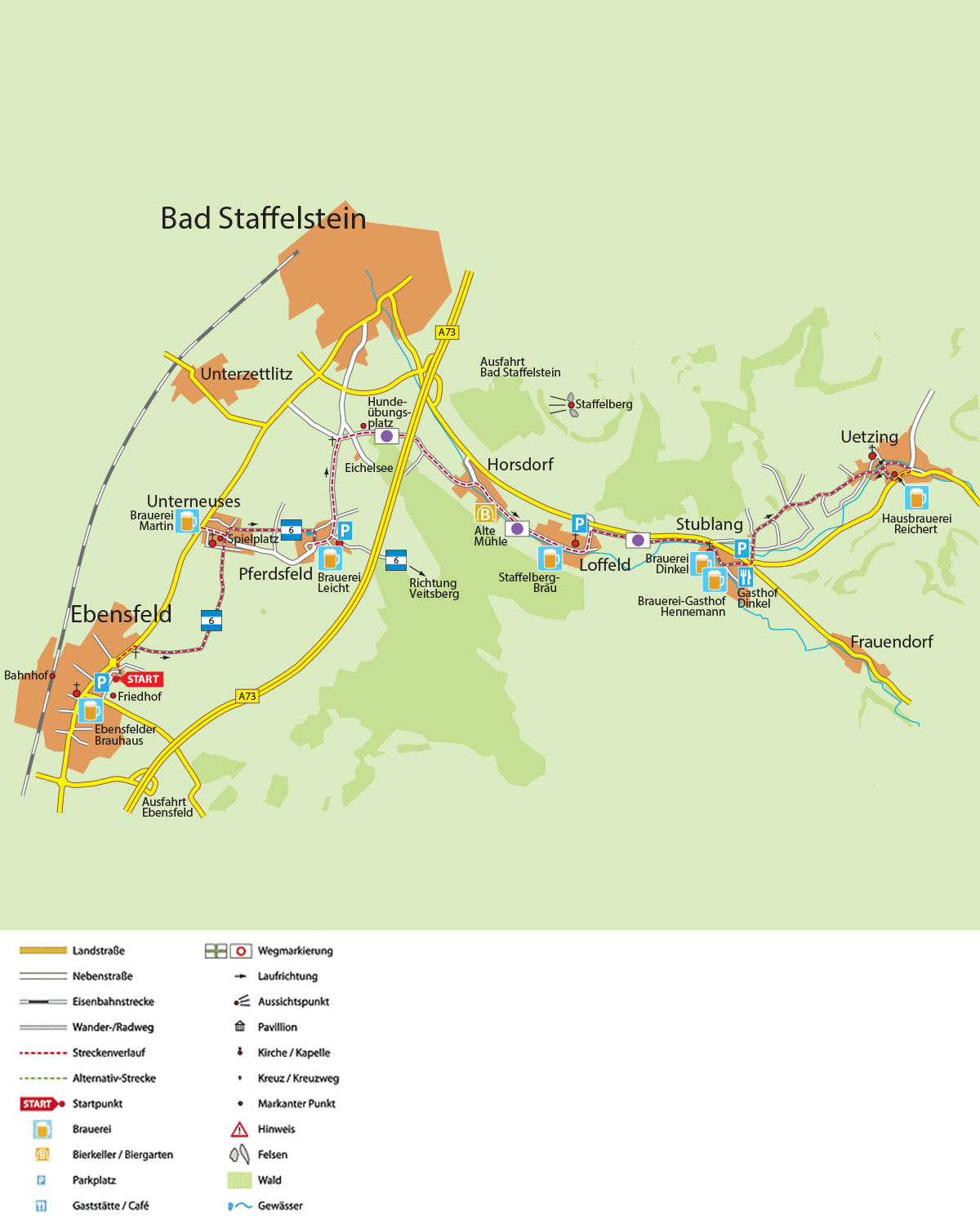 In Unterneuses müssen Sie nach dem Spielplatz einen kurzen Abstecher nach links machen, um zum Brauerei-Gasthof Martin zu gelangen (mittlerweile leider ohne eigenes Bier). Dann folgen Sie der „6” weiter nach Pferdsfeld. Am Weiher rechts abbiegen und an der Brauerei Leicht vorbei durch den Ort fahren. Hier wird nur noch sporadisch gebraut, also viel Glück! Bleiben Sie nun auf der kleinen Landstraße Richtung Bad Staffelstein, bis an einem Steinkreuz rechts der Radweg mit dem lila Punkt abzweigt. Unter der Autobahn hindurch geht es über Horsdorf nach Loffeld zur Staffelberg Bräu.