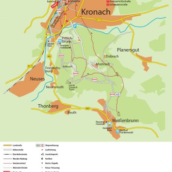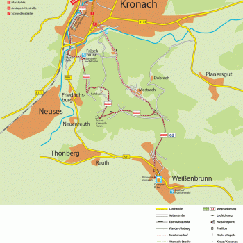 Los geht es am Bahnhof von Kronach. Sie treten aus dem Bahnhofsgebäude hinaus und laufen gerade in die Bahnhofstraße hinein. Zuerst überqueren Sie das Flüsschen „Haßlach“ und kurz darauf noch die „Kronach“. Am Ufer der Kronach treffen Sie auf die Markierung „Frankenweg“, der Sie von nun an folgen. Es geht rechts am Fluss entlang zum Gelände der Landesgartenschau von 2002, das Sie durchqueren und dann an einem Skater-Park Richtung Fröschbrunn verlassen. Sie laufen an dem Wirtshaus „Fröschbrunna“ mit seiner Sommerrodelbahn vorbei und danach stetig bergauf in den Wald hinein bis zum Lucas-Cranach-Turm. Der Turm bietet eine tolle Fernsicht auf die Umgebung. Nun führt der Frankenweg ein Stück auf der Höhe weiter, bevor es rechts bergab Richtung Weißenbrunn geht.