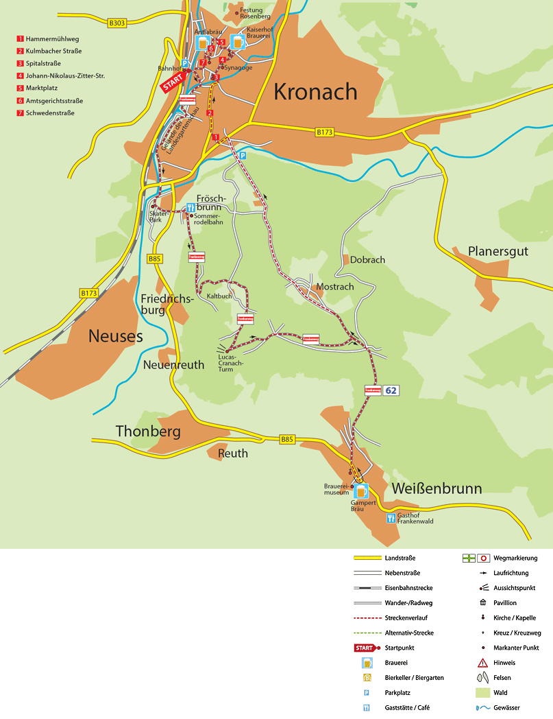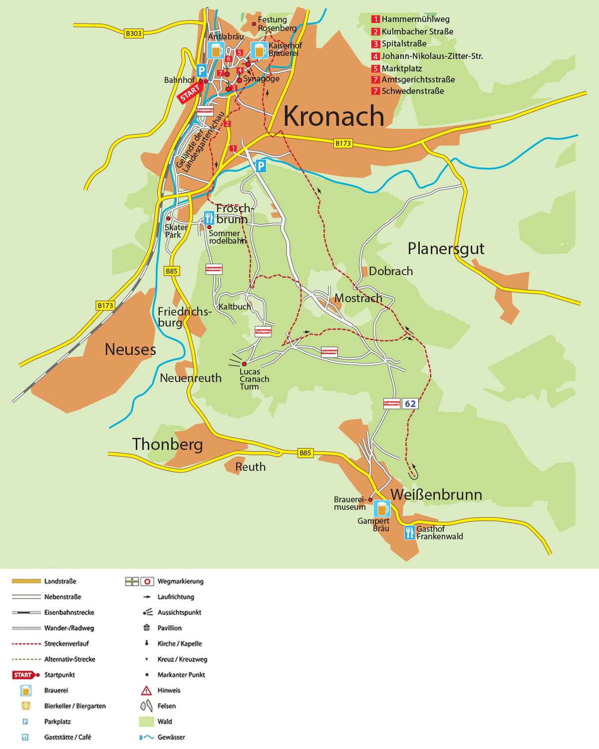 Im Ort finden Sie die Gampert Bräu und das Brauereimuseum, das nach Voranmeldung besichtigt werden kann. Die Brauerei selbst hat keine eigene Gastronomie – Sie können aber ein Stück weiter in den Ort zum Gasthof Frankenwald laufen, der Bier der Gampert Bräu führt. Auf dem bekannten Weg gehen Sie nun wieder bergauf, bis der Frankenweg links zum Lucas-Cranach-Turm abzweigt. Diesen Abzweig lassen Sie links liegen und laufen gerade aus Richtung Mostrach (Markierung: „Nordic-Walking-Route“). Von diesem kleinen Ort aus geht es gerade den Berg hinunter nach Kronach. Sie erreichen die Bundesstraße 173, gehen ein Stück nach links und laufen dann rechts in den Hammermühlweg.