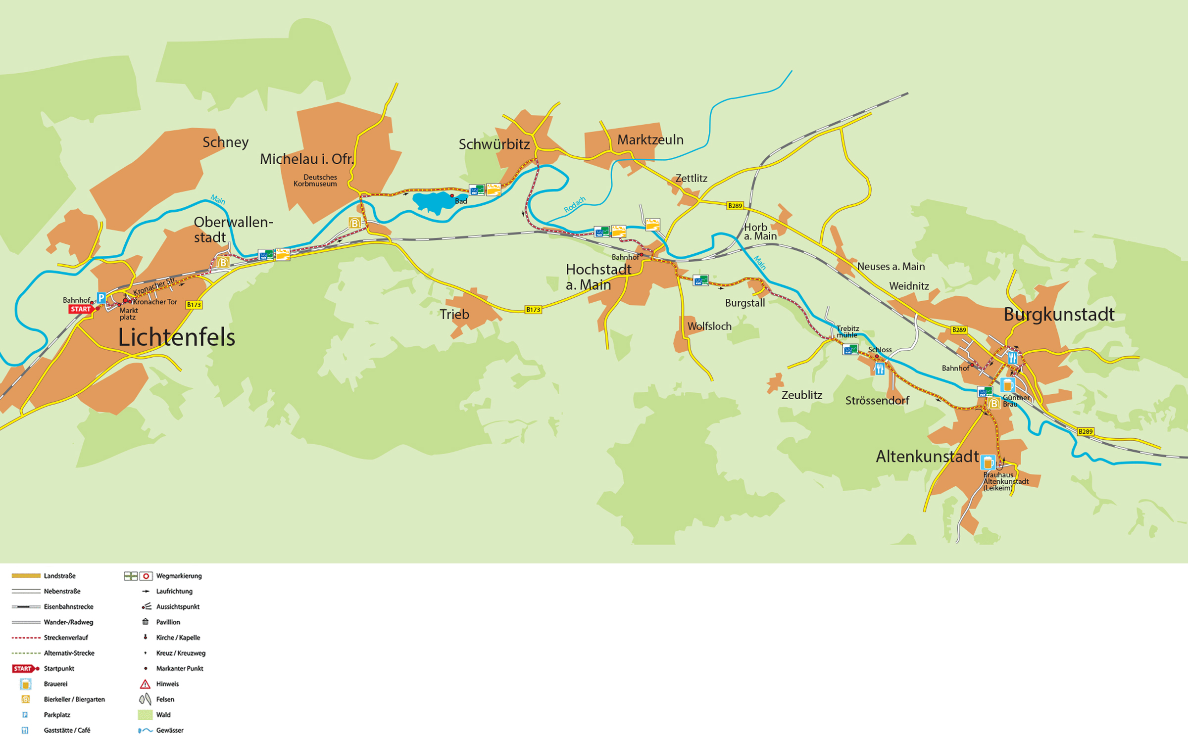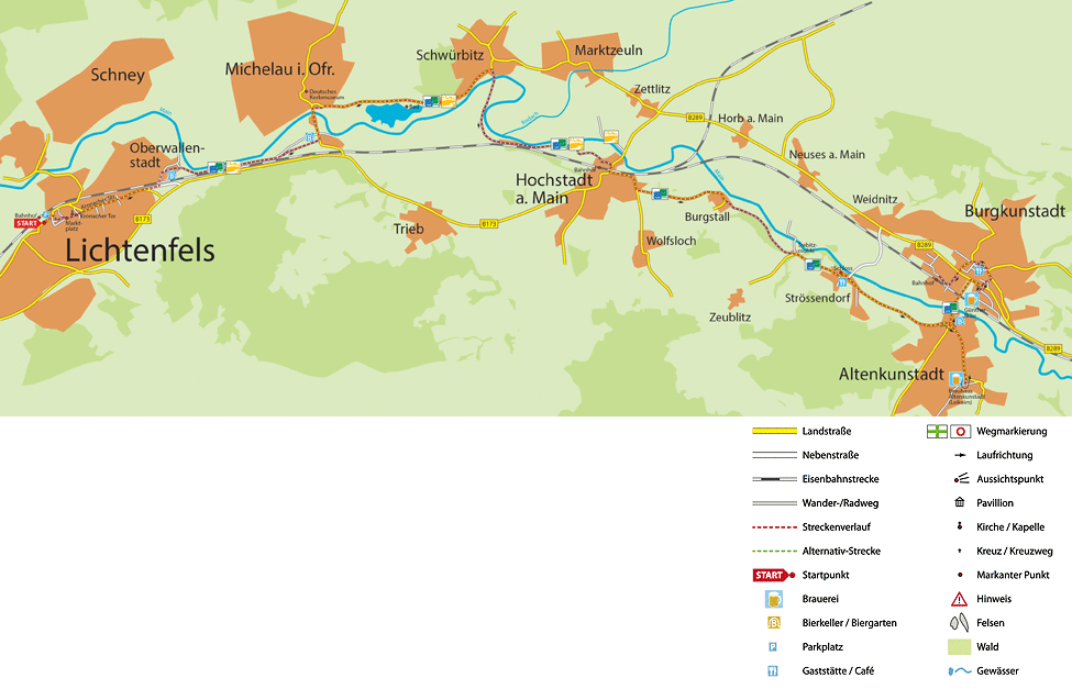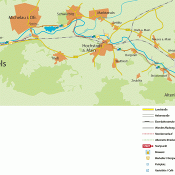 Diese Radtour entlang des Mains startet am Bahnhof Lichtenfels. Von dort fahren Sie durch die Judengasse zum Marktplatz. Dort finden Sie auch die ersten Schilder „Main-Radweg” Richtung Michelau (bis Hochstadt ist der Radweg auch mit der gelben Stadtsilhouette der Main-Coburg-Tour ausgeschildert). Durch die Kronacher Straße fahren Sie aus Lichtenfels hinaus in den Vorort Oberwallenstadt.