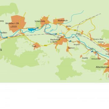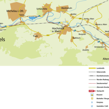 Danach müssen Sie umdrehen und dem Mainradweg nach Burgkunstadt folgen. Im Industriegebiet „In der Au” finden Sie die Günther-Bräu. Hier verlassen Sie den Main-Radweg, drehen um und fahren auf der anderen Seite der Bundesstraße 289 über den Auweg nach Burgkunstadt hinein. In der Kulmbacher Straße finden Sie die Brauerei-Gaststätte der Günther-Bräu. Über die Bahnhofstraße gelangen Sie dann zum Bahnhof, von wo aus es mit dem Zug zurückgeht.