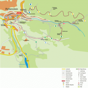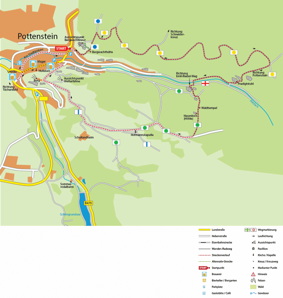 Von der Hofmannskapelle aus laufen Sie dann immer geradeaus bis zur Burg Pottenstein, wo es rechts über den alten Burgweg hinunter nach Pottenstein geht. Unten angekommen biegen Sie links in die Hauptstraße ein, wo Sie die beiden Brauereien finden; Über die Straße „Am Stadtgraben“ geht es dann zurück zum Startpunkt.