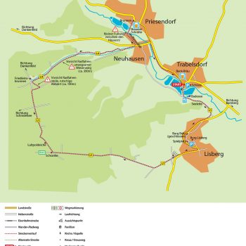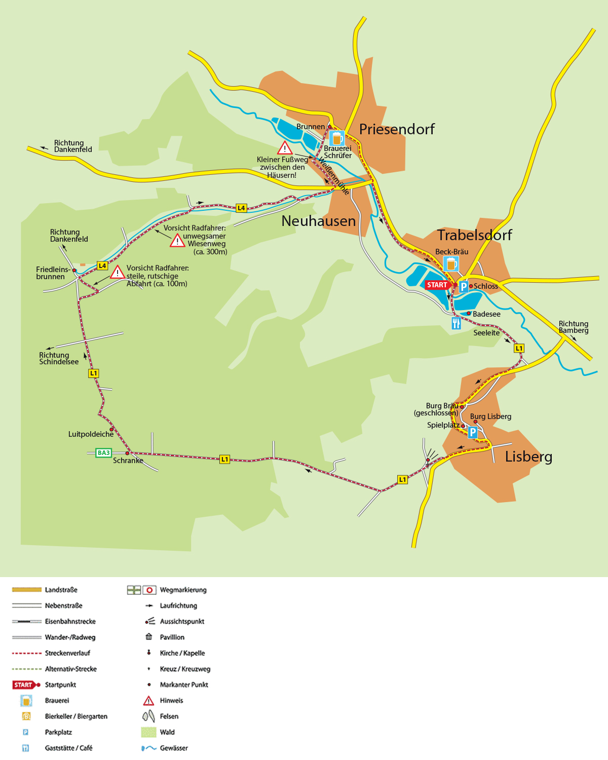 Nun folgen Sie der Markierung L4 durch einen Wiesengrund hinunter nach Neuhausen. Dort angekommen geht es links in die Straße „Weißmühle“, an deren Ende rechts ein kleiner Fußweg zwischen den Häusern hindurch nach Priesendorf führt. Am Brunnen biegen Sie nach rechts zur Brauerei an und dann geht es auf dem Fahrradweg neben der Straße zurück nach Trabelsdorf.