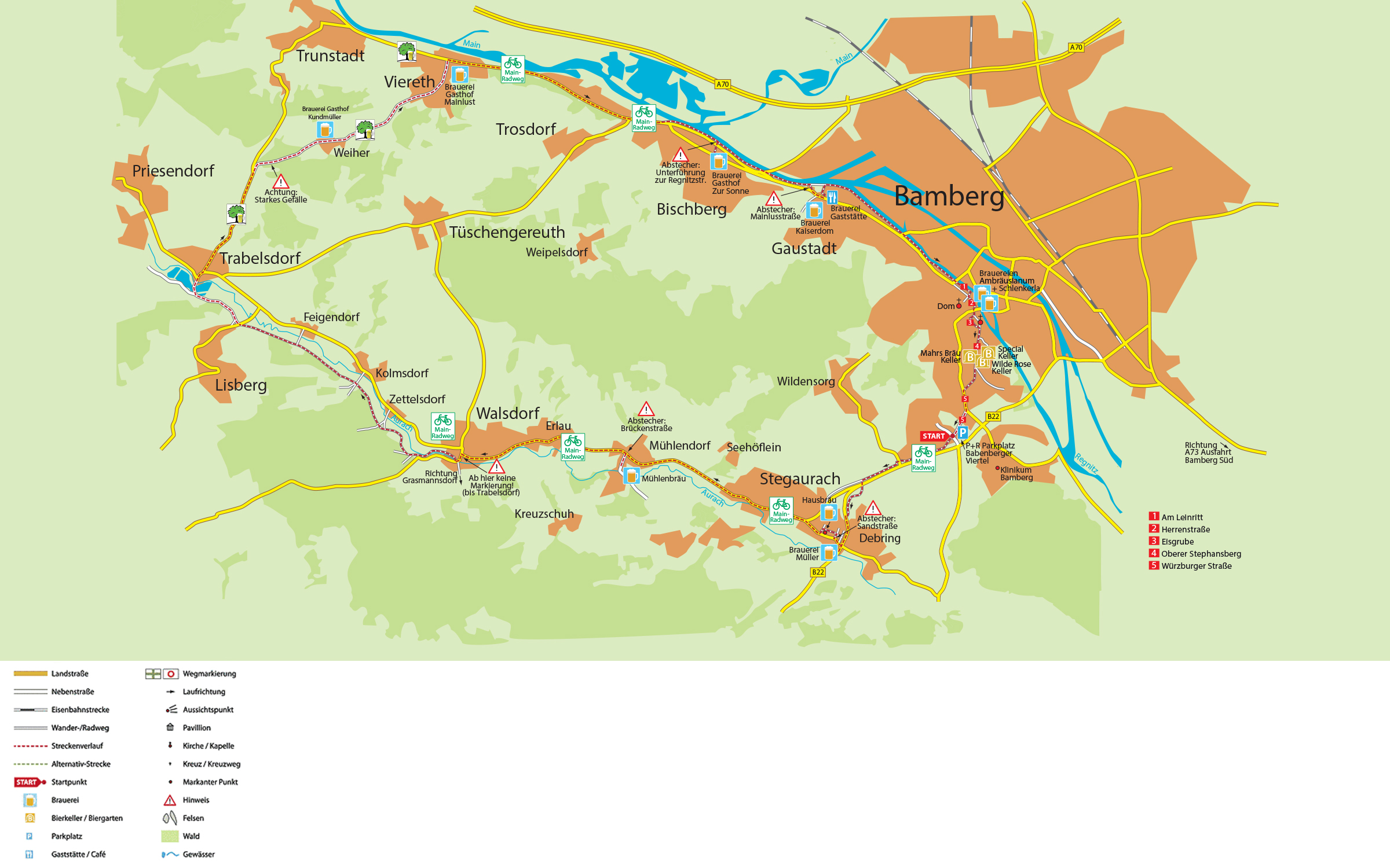 Startpunkt dieser Radtour ist der Park&Ride-Parkplatz „Babenberger Viertel“ am Münchner Ring (B22). An der Kreuzung Babenbergerring/Würzburger Straße finden Sie die Ausschilderung Steigerwald-Radweg „Obere Aurach“, der Sie Richtung Stegaurach folgen. Vor Stegaurach verlassen Sie diesen Radweg und folgen links der Ausschilderung nach Debring, wo Sie am Ortsausgang die erste Brauerei finden. Von dort müssen Sie wieder ein Stück zurück und dann links in die Auracher Straße Richtung Stegaurach. Über die Sandstraße gelangen Sie zur Ruhlstraße, in der die zweite Brauerei liegt.