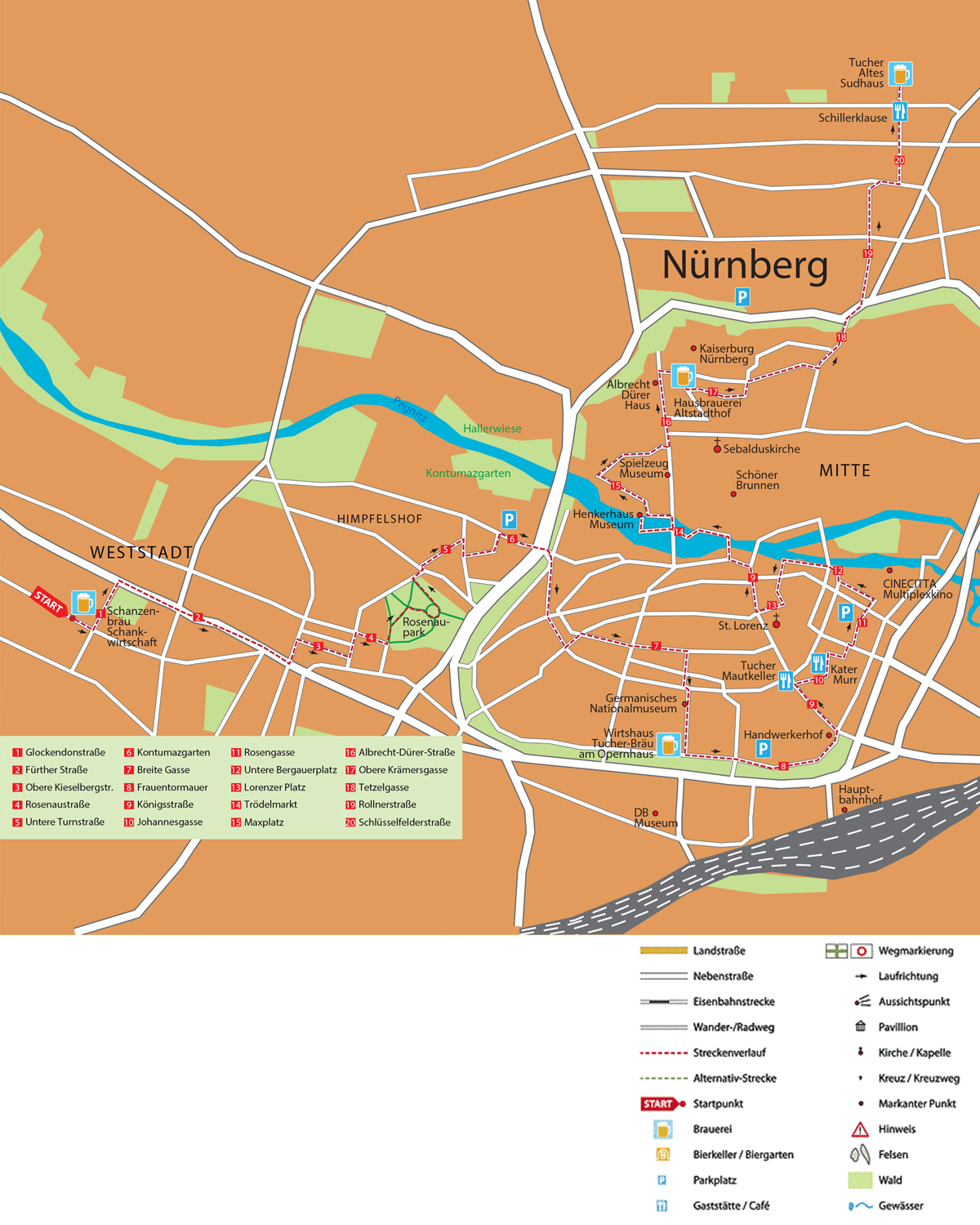 Über die Glockendonstraße umrunden Sie die Veit-Stoß-Anlage und gelangen in die Fürther Straße, halten sich auf der linken Seite und biegen gegenüber der zugegebenermaßen kleinen „Stadtwiese“ durch das Datev-Gebäude links nach Norden auf die Roonstraße ab. Rechts geht es in die Obere Kieselbergstraße zur Kaffeerösterei Machhörndl. Über die Bleich- und die Rosenaustraße kommen Sie zum Rosenaupark, der eine kleine Kaffee-Oase und den Minnesängerbrunnen beherbergt. Sie umrunden die vier Barden von 1905 und gehen über die Bleich- und die Untere Turmstraße zur Praterstraße, die Sie über die Waltherstraße und den Kontumazgarten zum Westtor und damit ins Innere der wiederaufgebauten Nürnberger Altstadt führt. Sie biegen rechts in die Kappengasse ein und gelangen zum „turmdersinne“, wo Sie spannende Experimente mit Ihrer Sensorik erleben dürfen. Im Anschluss gehen Sie nach Süden zur Kirche St. Elisabeth, wo Sie links in die Nürnberger Einkaufsmeile, die Breite Gasse einbiegen. Die kleine Krebsgasse führt Sie rechts über den Kornmarkt zum Germanischen Nationalmuseum, wo man auch Tage auf den Spuren der Deutschen Geschichte verbringen könnte. Eine Stärkung bekommen Sie im Anschluss, im nagelneu renovierten Wirtshaus Tucher Bräu am Opernhaus. Im Sommer sitzt es sich wunderschön im lauschigen Garten, bei einem kühlen, frischen Fassbier. Hier finden Sie ein spezielles Rotbier, das mit holzfassgereiftem Doppelbock veredelt wird.