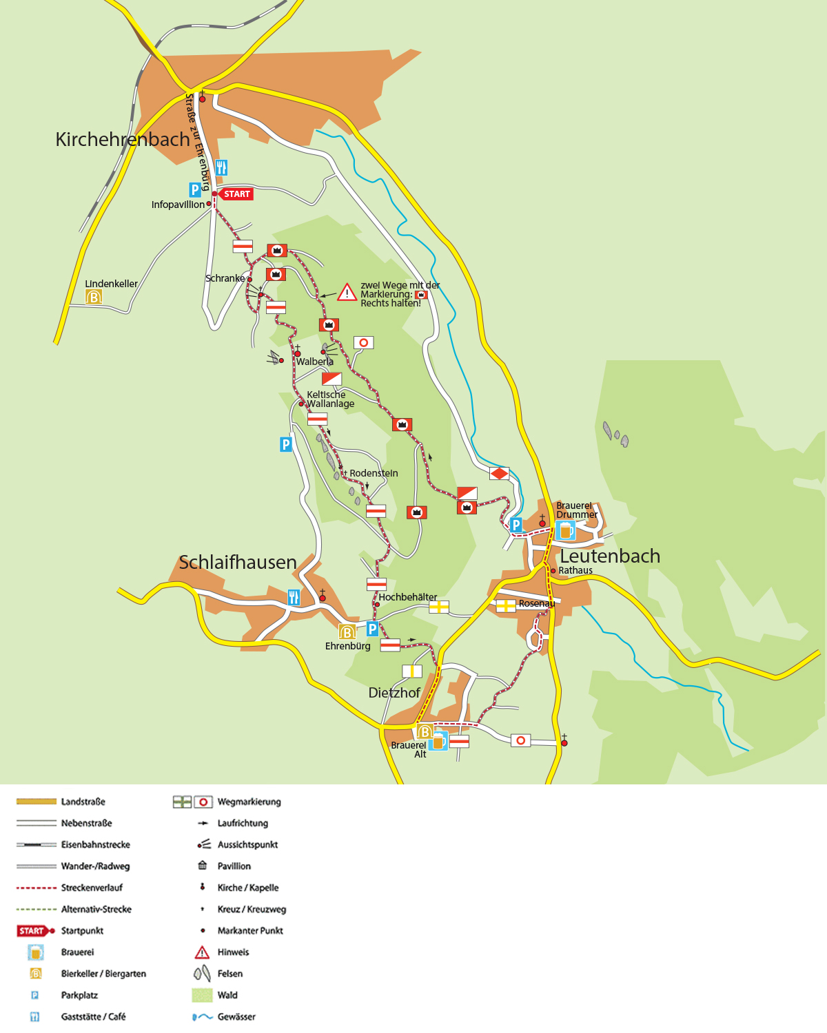 Am Rathaus vorbei kommen Sie zur Brauerei Drummer in der Dorfstraße. Gleich nach der Brauerei geht es vor der Kirche links in die Ehrenbürgstraße. Im weiteren Verlauf folgen Sie dem Walberla-Rundweg (Markierung: „rotes Schild mit weißem Kreis und schwarzer Walberla-Silhouette“). Dieser führt auf halber Höhe am Hang entlang durch den Wald. Zuletzt verlässt der Weg den Wald, und nach kurzer Strecke führt die Markierung „roter Querstrich“ wieder hinunter zum Ausgangspunkt.